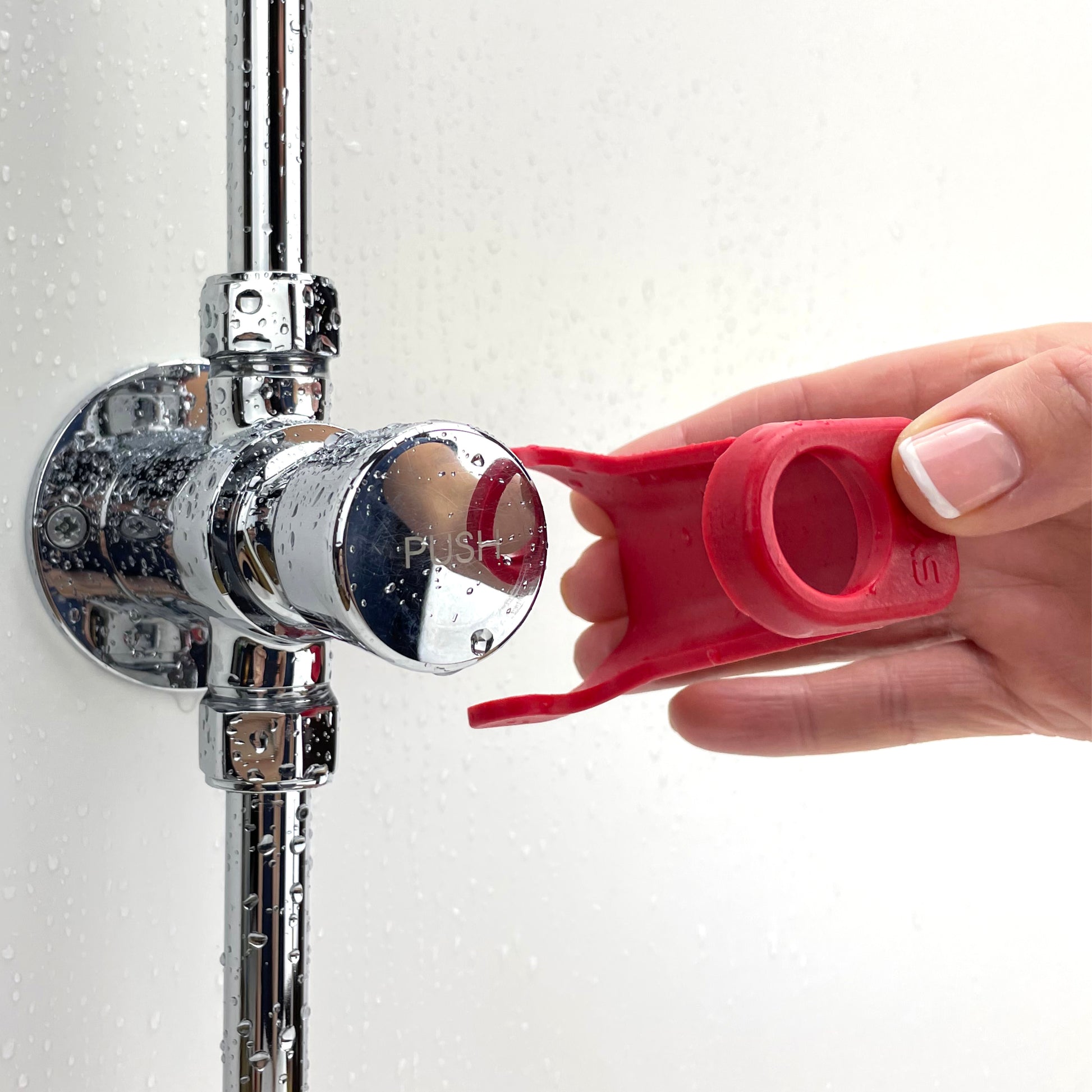 The Synio Shower Attachment is designed to fit over the button to keep it pressed in so the shower doesn’t turn off until you take it off.